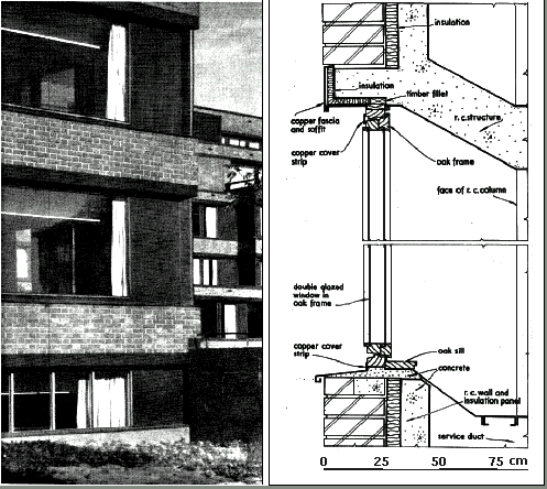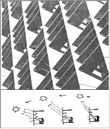 Ilustra-se a integração destas medidas na arquitectura, no seguinte pormenor do Instituto Nacional de Pensões (Figura 10), em que Alvar Aalto, com elegante simplicidade e de harmonia com o clima frio e pouco ensoalhado de Helsínquia, combina o isolamento térmico e a iluminação natural, numa fachada de marcada horizontalidade. A altura do vão predomina sobre a do pano de peito, pelo artifício de um chanfro na lage que, sobreelevando a verga, faculta mais luz para o fundo da sala.