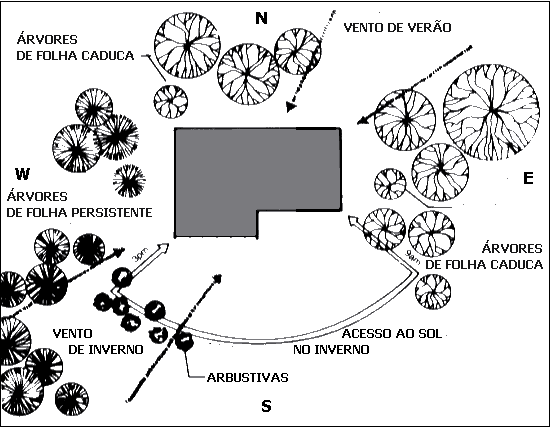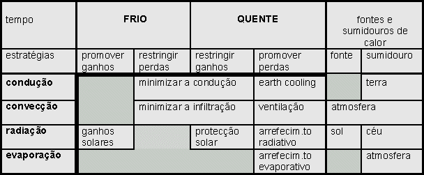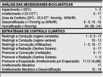 O quadro inserido na Figura 2, apresenta as estratégias bioclimáticas sistematizadas, agrupando-as em estratégias para o tempo FRIO e estratégias para o tempo QUENTE (abrangendo estas também o tempo CONFORTAVEL).