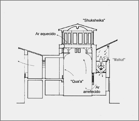 Nos sistemas mais completos, estas torres de ventilação que também podem puxar o ar refrescado numa cave ("serdab"), ou o captador de vento, "malkaf" no Egipto ou no Iraque ( Figura 26), são complementados por lanternins sobreelevados ("shuksheika") sobre o "dorqua´a" (centro da sala. designada por "qua´a") que pode ser marcado por um pequeno lago refrescante. Estes lanternins aquecidos pelo sol, forçam a aspiração do ar exterior por tiragem térmica, ajudando assim a ventilação transversal, como se pode ver na Figura 52.