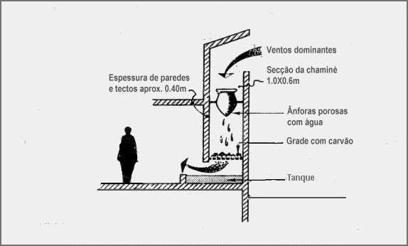 Também se encontram ânforas integradas em torres de ventilação ("badgeer", no Irão) que canalizam para o interior o ar que é arrefecido ao tocar as paredes das ânforas ressumando água, para depois ser desumidificado ao passar por um tabuleiro com carvão dessecante, como mostra a Figura 51 e a Figura 52.