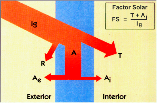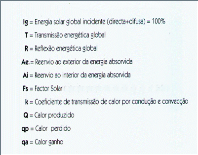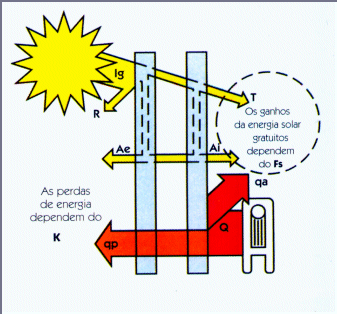 No isolamento dos envidraçados, deve-se ter presente que o seu balanço térmico combina as trocas por condução que dependem do valor U, com as trocas radiativas que dependem do factor solar Fs, conforme se esquematiza na Figura 8.