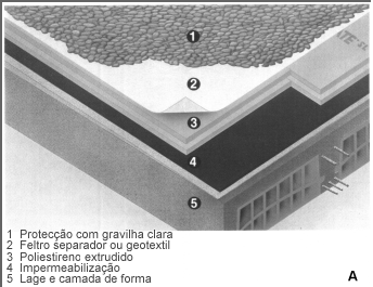 O isolamento térmico do terraço deve ser colocado entre a lage e a camada de forma , tendo em vista protege-lo, corrigir as pontes térmicas e reduzir o risco de condensações. Existem hoje materiais isolantes, como o polestireno extrudido que podem ser aplicados sobre o impermeabilizante no que se designa por cobertura invertida, conforme se mostra na Figura 6A.