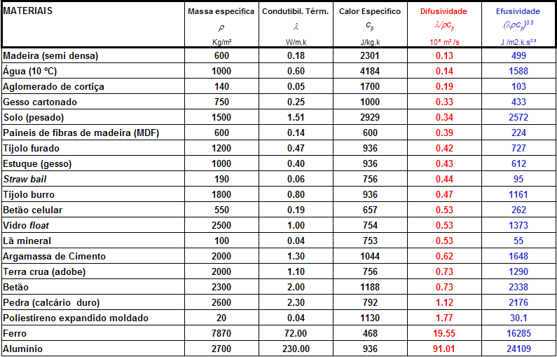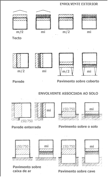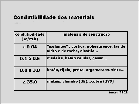 O nível de isolamento térmico do invólucro, ou seja a sua resistência térmica, pode-se reforçar aumentando espessuras e utilizando materiais menos condutores. A regulamentação atinente em vigor (ver Bibliografia) é concisa nesta matéria, sobre a qual existe informação técnica acessível, designadamente na ITE 50 (LNEC, 2006) e, em Henriques (Humidade em Paredes, LNEC 1995). Para orientação, alguns materiais de construção mais correntes são agrupados por categorias de condutibilidade térmica, no quadro da Figura 4. Consultar também a Figura 24 .