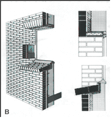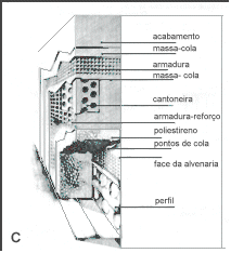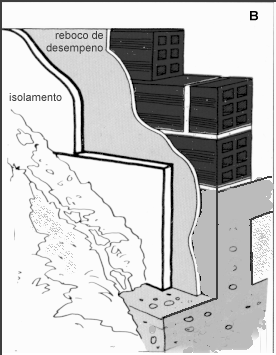 A camada de material isolante pode ainda ser colocada pelo interior ou pelo exterior de paredes simples. Tal como se mostra na Figura 5C, o isolamento de paredes pelo exterior tem que ser protegido por redes e perfis incorporados na massa rígida de acabamento, devido à fraca resistência mecânica dos isolantes leves. A sua aplicação é pois, problemática em fachadas muito recortadas, com muitos vãos, mas pode ser vantajosa nos outros casos e, designadamente, em recuperações.