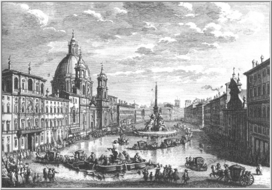 No ano de 1652, num dia escaldante e poeirento do Agosto mediterrâneo, o papa Inocêncio mandou abrir as valvulas inferiores da Fonte dos Quatro Rios, para alagar a praça.