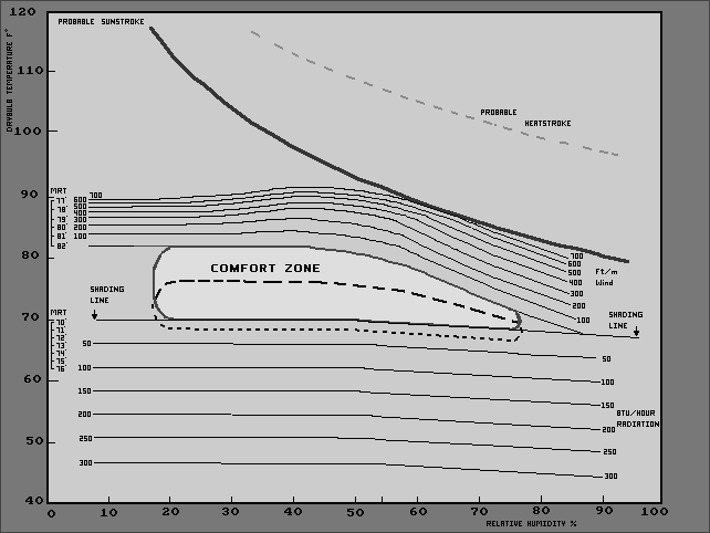 A Carta Bioclimática de Olgyay, apresentada na Figura 56, assinala num diagrama cartesiano com a humidade relativa nas abcissas e a temperatura do bolbo seco nas ordenadas, uma zona de conforto de Verão e outra de Inverno, para um habitante de climas moderados dos EUA, em locais com altitude inferior a 300.0 m, com vestuário usualmente usado (nos EUA) dentro de casa e uma actividade sedentária ligeira. Os elementos climáticos que envolvem a zona de conforto, têm a forma de de curvas que indicam a natureza das medidas necessárias para restaurar a sensação de conforto em qualquer ponto fora da zona de conforto, como explica Olgyay (1963).