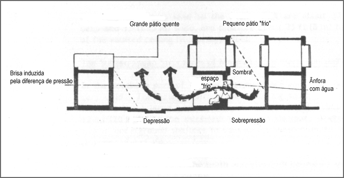 Durante o dia, o pátio é aquecido pelo sol, gerando-se uma depressão convectiva que, em climas muito calmos, pode ajudar a ventilação transversal do edifício, por tiragem térmica.