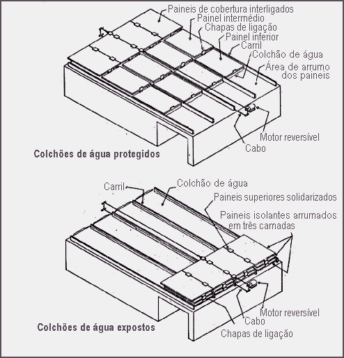 È o caso do sistema patenteado SkyTherm de Harold Hay (Hay H. e Yellot J. 1970. A Naturaly Airconditioned Building. Mechanical Engineering. Vol 32, pg 19-23), esquematizado na Figura 49, tal como foi aplicado em Atascadero, California. Os 115.0m2 da Skytherm House são cobertos por 4 colchões de água de 11.6X2.4X0.25m assentes sobre um tecto metálico. O interior mantem-se confortável ao longo do ano por este sistema, num clima que oscila entre 0.0ºC e 34.0ºC (média das mínimas em Janeiro e das máximas em Julho).