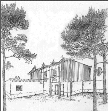 O terraço ensoalhado é refrescado pela água da piscina. A piscina recebe água corrente vinda de um fresco registo de azulejos, sombreado pela arcada. A arcada cava-se no volume maciço da casa que, através dela, se abre sobre o terraço ensoalhado e a piscina. O volumoso chapéu da cobertura acusa a sua função protectora. A sombra fresca das árvores serve de pano de fundo, acentuando a protecção da casa pelo lado Norte...Sombreamento, inércia térmica, superfícies frias, arrefecimento evaporativo, bem estar no Verão...férias, a imagem de um paraíso acessível!