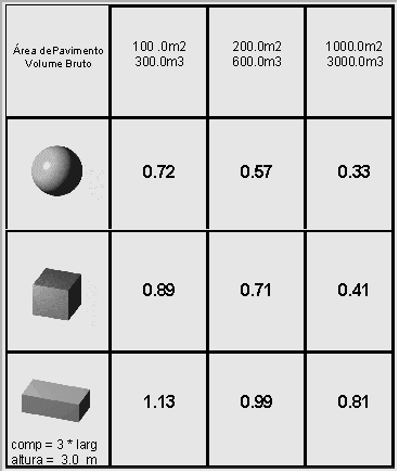 Atente-se no quadro da Figura 9 que relaciona a razão superficie envolvente/volume encerrado (factor forma) com a forma e a escala.