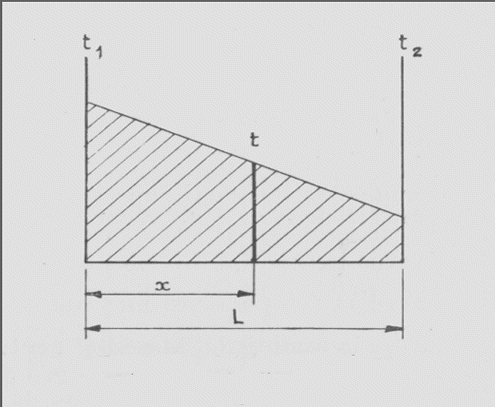 Presumindo que a temperatura interior também é sensivelmente constante, pode admitir-se que a transmissão de calor através do invólucro, se faz em regime permanente, distribuindo-se as temperaturas no interior de uma parede homogénea, como se mostra na Figura 3.